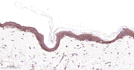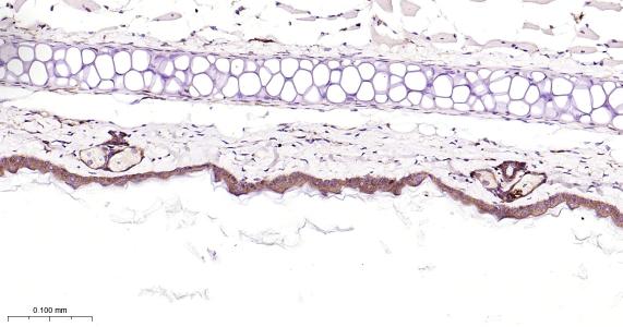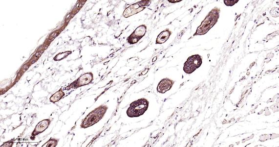 Paraformaldehyde-fixed, paraffin embedded Mouse Skin; Antigen retrieval by boiling in sodium citrate buffer (pH6.0) for 15 min; Antibody incubation with EGFR Monoclonal Antibody, Unconjugated(bsm-52317R) at 1:200 overnight at 4°C, followed by conjugation to the bs-0295G-HRP and DAB (C-0010) staining.