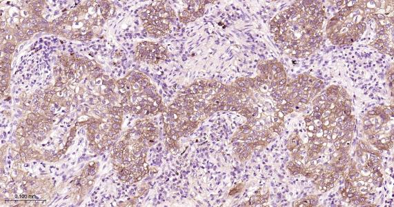 Paraformaldehyde-fixed, paraffin embedded Human Lung squamous cell carcinoma; Antigen retrieval by boiling in sodium citrate buffer (pH6.0) for 15 min; Antibody incubation with EGFR Monoclonal Antibody, Unconjugated(bsm-52317R) at 1:200 overnight at 4°C, followed by conjugation to the bs-0295G-HRP and DAB (C-0010) staining.