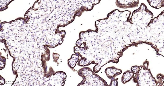 Paraformaldehyde-fixed, paraffin embedded Human Placenta; Antigen retrieval by boiling in sodium citrate buffer (pH6.0) for 15 min; Antibody incubation with EGFR Monoclonal Antibody, Unconjugated(bsm-52317R) at 1:200 overnight at 4°C, followed by conjugation to the bs-0295G-HRP and DAB (C-0010) staining.