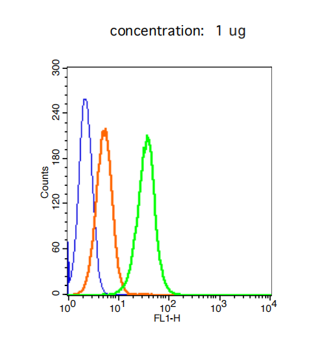 The cells were fixed with 2% paraformaldehyde (10 min) . The cells were washed twice with 1 X PBS. The cells were incubated in 1 X PBS containing 0.5% BSA + 1 0% goat serum (15 min) to block non-specific protein-protein interactions followed by the incubated with antibody (bs-1424R/AF488, 1μg /1x10^6 cells) for 30 min on ice. Acquisition of 20,000 events was performed.