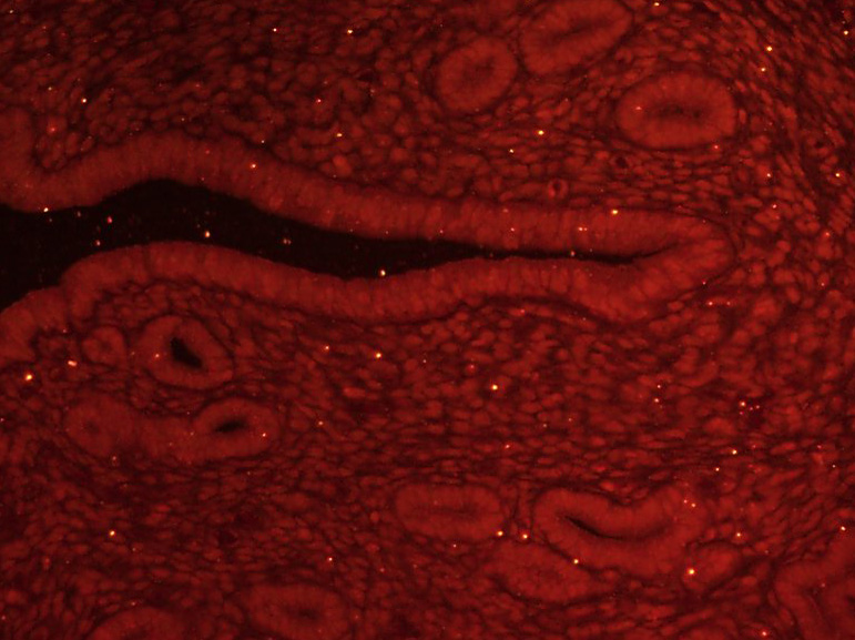Paraformaldehyde-fixed, paraffin embedded (Mouse uterus); Antigen retrieval by boiling in sodium citrate buffer (pH6.0) for 15min; Block endogenous peroxidase by 3% hydrogen peroxide for 20 minutes; Blocking buffer (normal goat serum) at 37°C for 30min; Incubation: Anti-GLI1 Antibody, conjugated (bs-1206R-BF555) at 1:100 overnight at 4°C; DAPI (5ug/ml, blue, C-0033) was used to stain the cell nuclei.