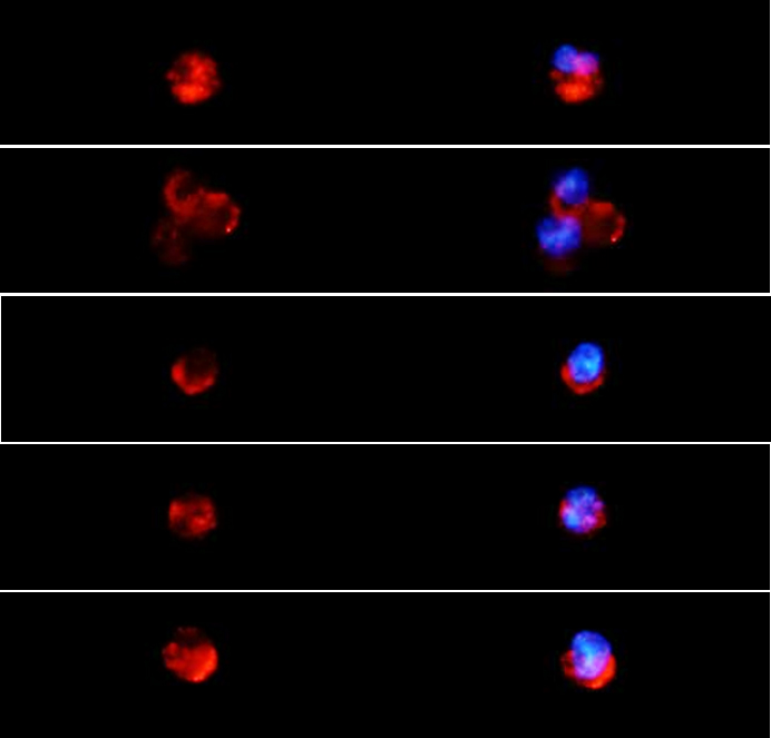 HL60 cell; 4% Paraformaldehyde-fixed; Ice-cold methanol at room temperature for 20 min; Blocking buffer (normal goat serum, C-0005) at 37°C for 20 min; Antibody incubation with (Anti-MPO) polyclonal antibody, A555 conjugated (bs-4943R-A555) 1:50, 90 minutes at 37°C; DAPI (blue, C02-04002) was used to stain the cell nuclei.