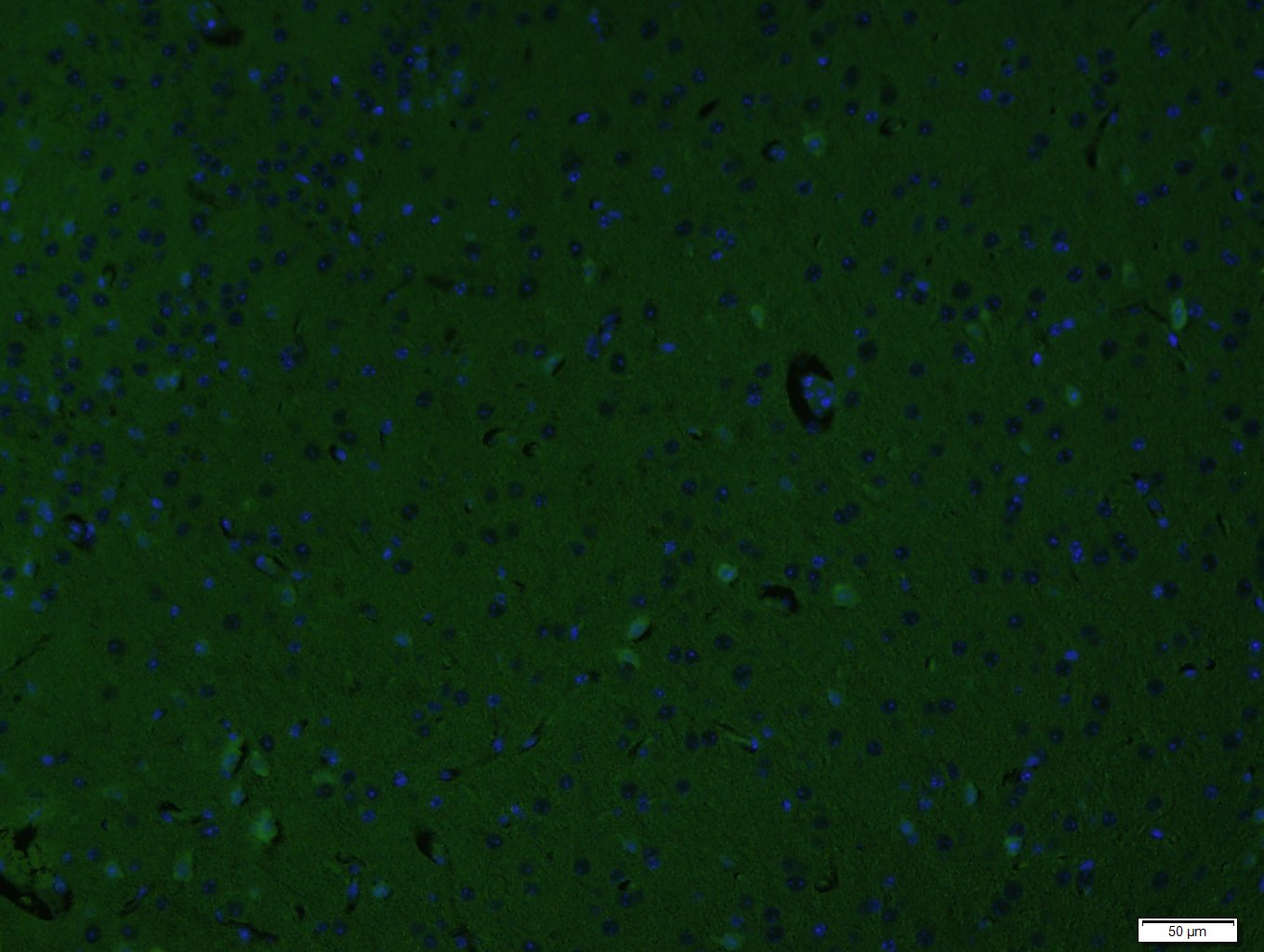 Paraformaldehyde-fixed, paraffin embedded (Mouse brain); Antigen retrieval by boiling in sodium citrate buffer (pH6.0) for 15min; Block endogenous peroxidase by 3% hydrogen peroxide for 20 minutes; Blocking buffer (normal goat serum) at 37°C for 30min; Incubation: Anti-CD34 Antibody, conjugated (bs-0646R-FITC) 1:400, 1.5 hours at 37°C; DAPI (5ug/ml, blue, C-0033) was used to stain the cell nuclei.