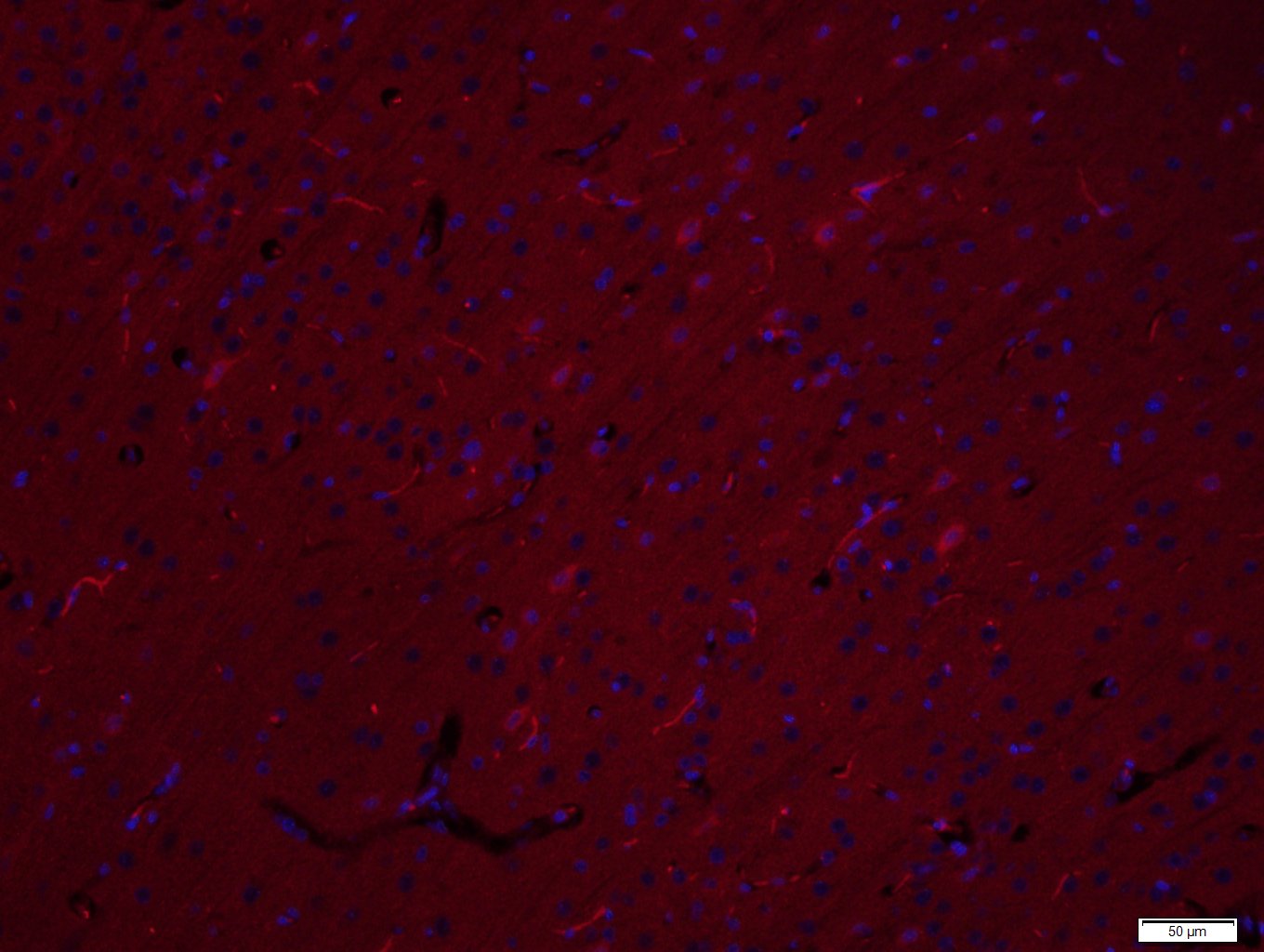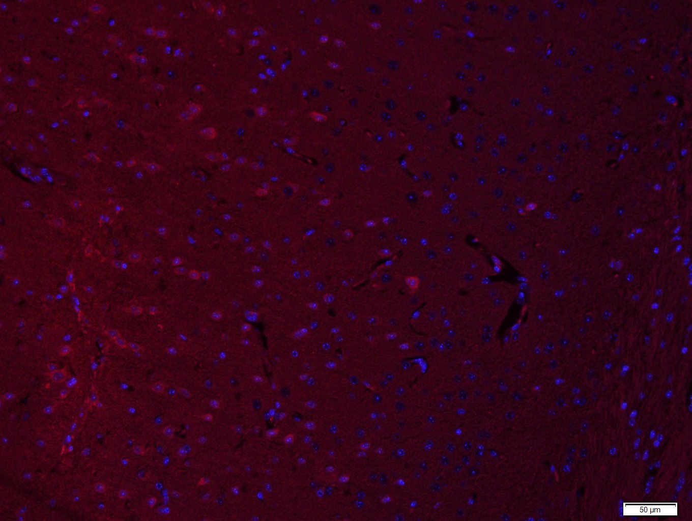 Paraformaldehyde-fixed, paraffin embedded (Rat brain); Antigen retrieval by boiling in sodium citrate buffer (pH6.0) for 15min; Block endogenous peroxidase by 3% hydrogen peroxide for 20 minutes; Blocking buffer (normal goat serum) at 37°C for 30min; Incubation: Anti-EIF2S1/eIF2 alpha Antibody, conjugated (bs-3613R-BF594) 1:400, 1.5 hours at 37°C; DAPI (5ug/ml, blue, C-0033) was used to stain the cell nuclei.