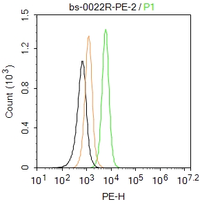 Blank control:NIH/3T3. Primary Antibody (green line): Rabbit Anti-ERK1 + ERK2 antibody (bs-0022R-PE) Dilution: 2μg /10^6 cells; Isotype Control Antibody (orange line): Rabbit IgG . Protocol The cells were fixed with 4% PFA (10min at room temperature)and then permeabilized with 90% ice-cold methanol for 20 min at -20℃. The cells were then incubated in 5%BSA to block non-specific protein-protein interactions for 30 min at room temperature .Cells stained with Primary Antibody for 30 min at room temperature.Acquisition of 20,000 events was performed.