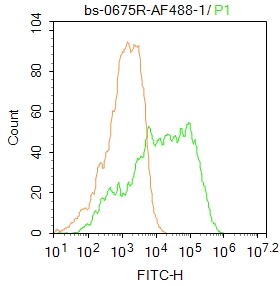 Blank control: Mouse kidney. Primary Antibody (green line): Rabbit Anti-FGFR2 antibody (bs-0675R-BF488) Dilution: 1μg /10^6 cells; Isotype Control Antibody (orange line): Rabbit IgG . Protocol The cells were incubated in 5%BSA to block non-specific protein-protein interactions for 30 min at at room temperature .Cells stained with Primary Antibody for 30 min at room temperature. Acquisition of 20,000 events was performed.
