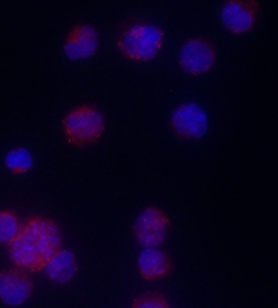 HL60 cell; 4% Paraformaldehyde-fixed; Ice-cold methanol at room temperature for 20 min; Blocking buffer (normal goat serum, C-0005) at 37°C for 20 min; Antibody incubation with (Anti-Myeloperoxidase) polyclonal antibody, A555 conjugated (bs-1061R-A555) 1:50, 90 minutes at 37°C; DAPI (blue, C02-04002) was used to stain the cell nuclei.
