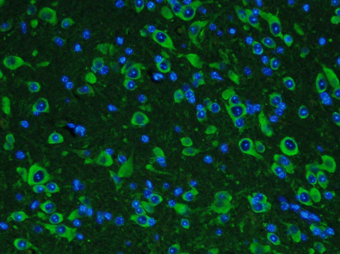 Paraformaldehyde-fixed, paraffin embedded (Mouse brain); Antigen retrieval by boiling in sodium citrate buffer (pH6.0) for 15min; Block endogenous peroxidase by 3% hydrogen peroxide for 20 minutes; Blocking buffer (normal goat serum) at 37°C for 30min; Incubation: Anti- GDNF Antibody, conjugated (bs-1024R-FITC) 1:400, 1.5 hours at 37°C; DAPI (5ug/ml, blue, C-0033) was used to stain the cell nuclei.