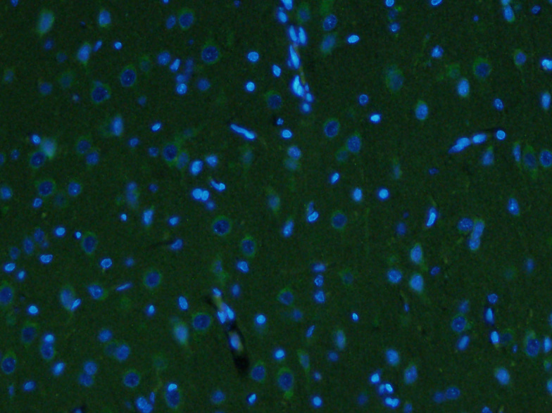 Paraformaldehyde-fixed, paraffin embedded (Rat brain); Antigen retrieval by boiling in sodium citrate buffer (pH6.0) for 15min; Block endogenous peroxidase by 3% hydrogen peroxide for 20 minutes; Blocking buffer (normal goat serum) at 37°C for 30min; Incubation: Anti-GDNF Antibody, conjugated (bs-1024R-A488) 1:400, 1.5 hours at 37°C; DAPI (5ug/ml, blue, C-0033) was used to stain the cell nuclei.