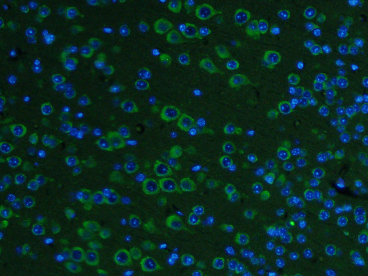 Paraformaldehyde-fixed, paraffin embedded (Mouse brain); Antigen retrieval by boiling in sodium citrate buffer (pH6.0) for 15min; Block endogenous peroxidase by 3% hydrogen peroxide for 20 minutes; Blocking buffer (normal goat serum) at 37°C for 30min; Incubation: Anti-GDNF Antibody, conjugated (bs-1024R-A488) 1:400, 1.5 hours at 37°C; DAPI (5ug/ml, blue, C-0033) was used to stain the cell nuclei.