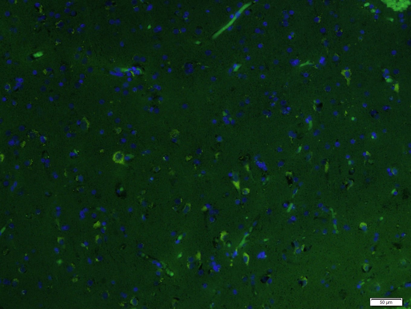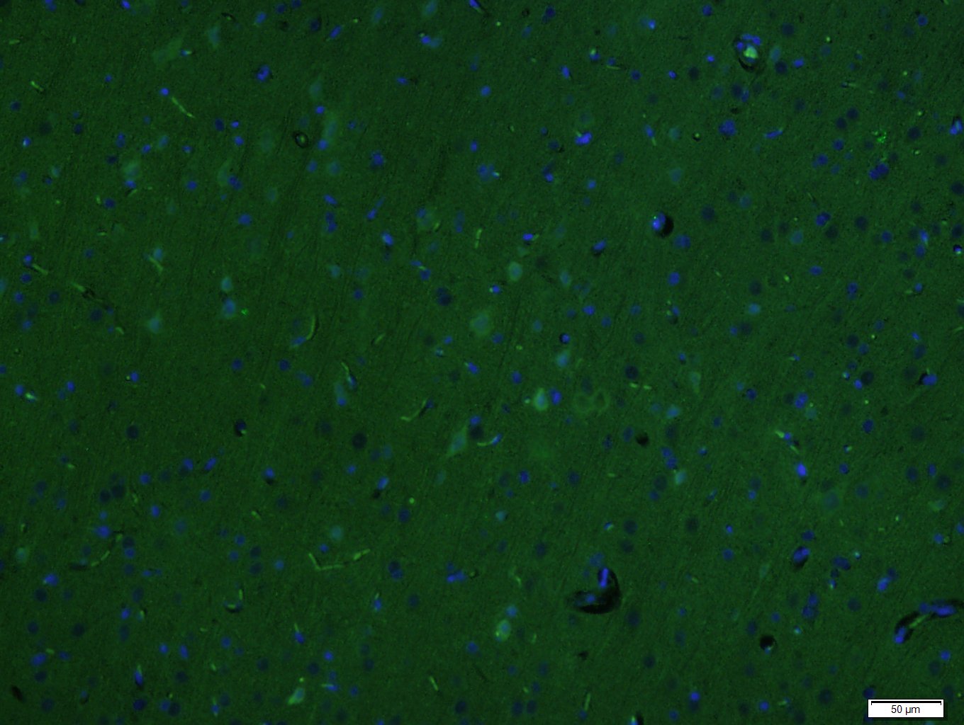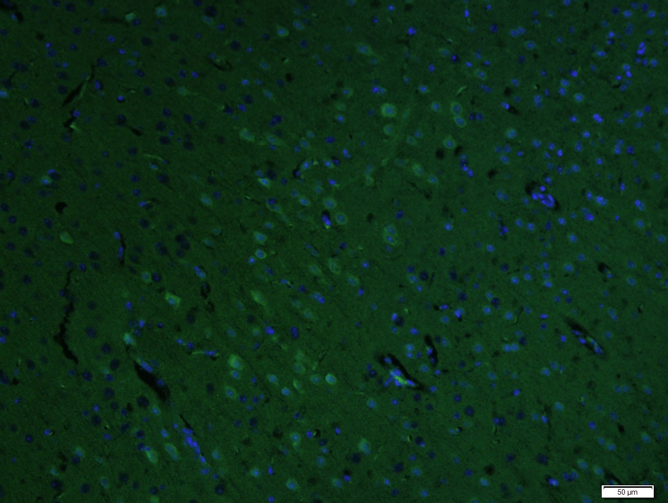 Paraformaldehyde-fixed, paraffin embedded (Rat brain); Antigen retrieval by boiling in sodium citrate buffer (pH6.0) for 15min; Block endogenous peroxidase by 3% hydrogen peroxide for 20 minutes; Blocking buffer (normal goat serum) at 37°C for 30min; Incubation: Anti-RhoA Antibody, conjugated (bs-1180R-BF488) 1:400, 1.5 hours at 37°C; DAPI (5ug/ml, blue, C-0033) was used to stain the cell nuclei.