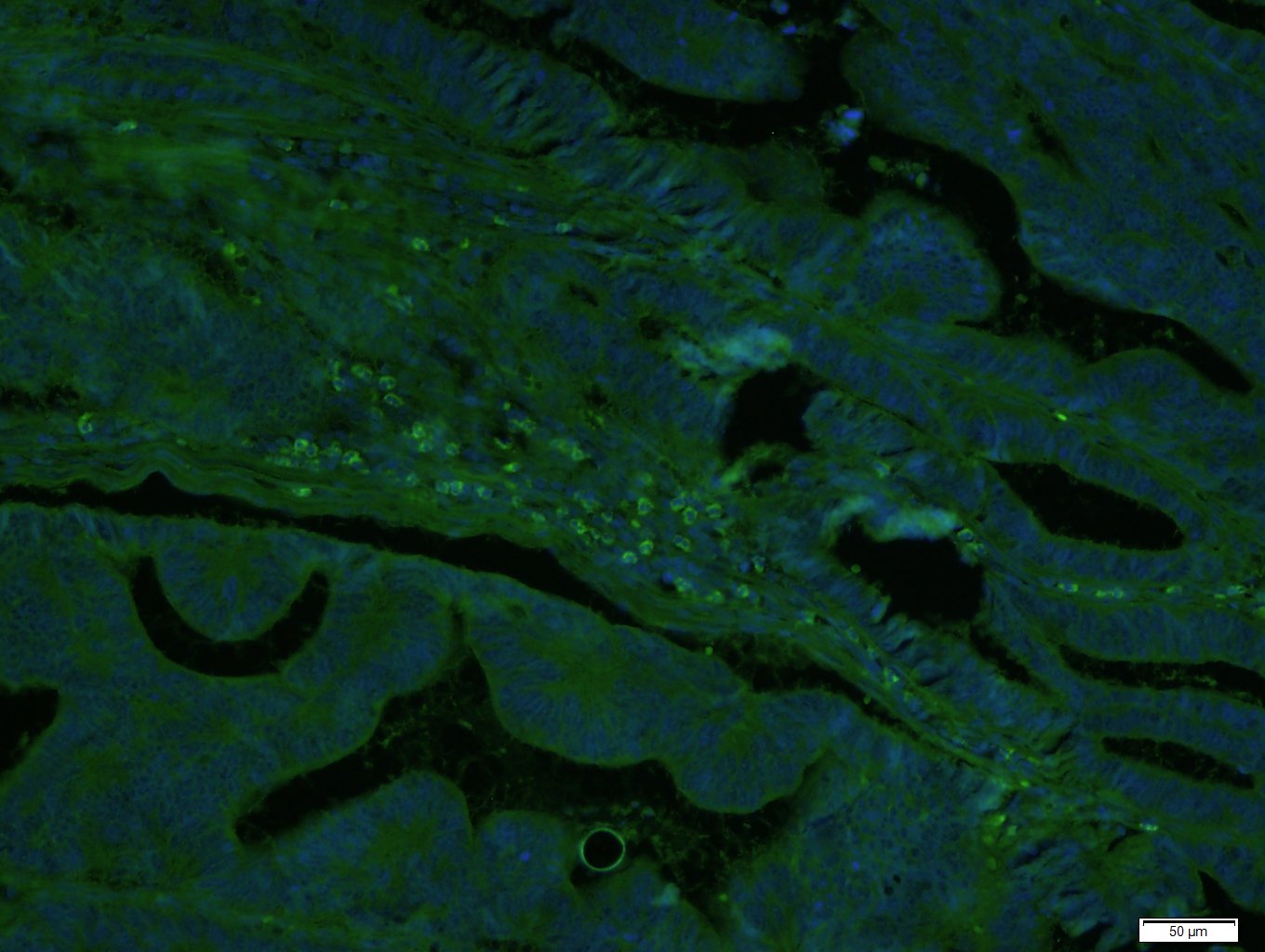 Paraformaldehyde-fixed, paraffin embedded (Human colon cancer); Antigen retrieval by boiling in sodium citrate buffer (pH6.0) for 15min; Block endogenous peroxidase by 3% hydrogen peroxide for 20 minutes; Blocking buffer (normal goat serum) at 37°C for 30min; Incubation: Anti-RhoA Antibody, conjugated (bs-1180R-BF488) 1:400, 1.5 hours at 37°C; DAPI (5ug/ml, blue, C-0033) was used to stain the cell nuclei.