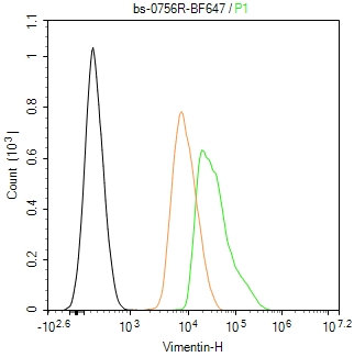 The Hela (H) cells were fixed with 4% PFA (10 min at r.t.) and then permeabilized with 90% ice-cold methanol for 20 min at -20℃,the cells then were incubated in 5%BSA to block non-specific protein-protein interactions (30 min at r.t.).Primary Antibody (green): BF647 conjugated Rabbit Anti-Vimentin antibody (bs-0756R-BF647): 1 μg/10^6 cells;Isotype Control (orange): Rabbit IgG/BF647 (bs-0295P-BF647). Blank control (black): PBS. Acquisition of 20,000 events was performed.