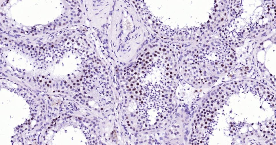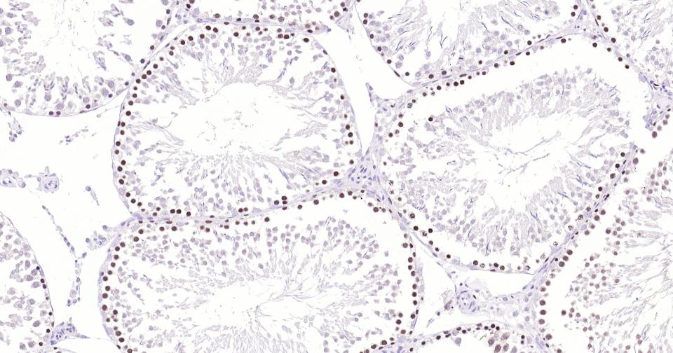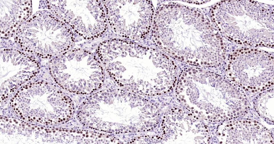Paraformaldehyde-fixed, paraffin embedded Rat Testicles; Antigen retrieval by boiling in sodium citrate buffer (pH6.0) for 15 min; Antibody incubation with PCNA/HRP Monoclonal Antibody, Unconjugated(bsm-33035M-HRP) at 1:200 overnight at 4°C, followed by DAB (C-0010) staining.