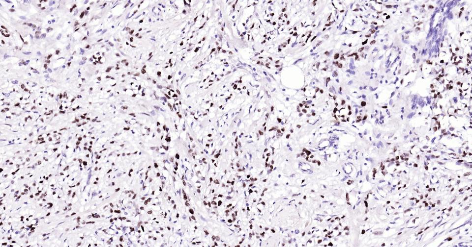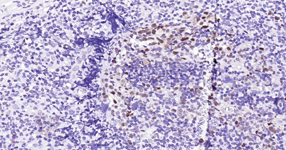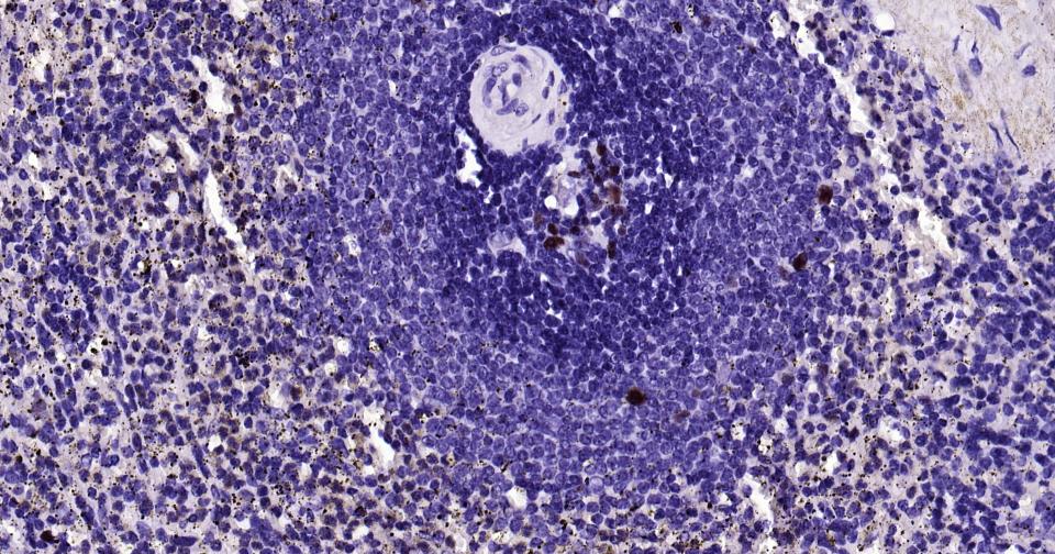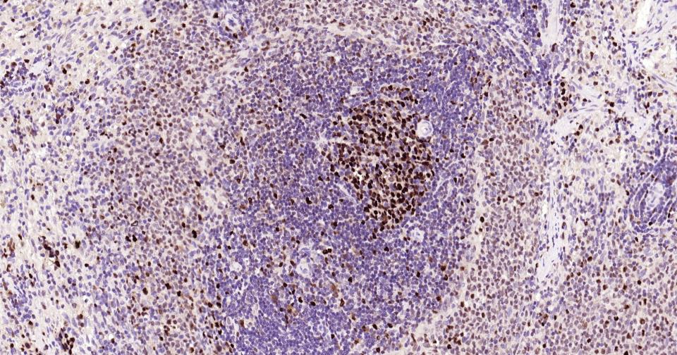 Paraformaldehyde-fixed, paraffin embedded Human Spleen; Antigen retrieval by boiling in sodium citrate buffer (pH6.0) for 15 min; Antibody incubation with PCNA/HRP Monoclonal Antibody, Unconjugated(bsm-33035M-HRP) at 1:200 overnight at 4°C, followed by DAB (C-0010) staining.