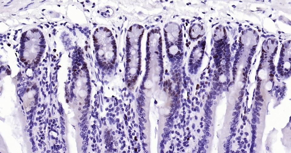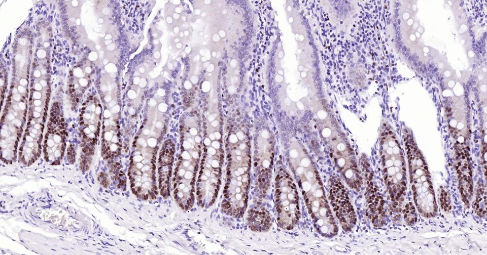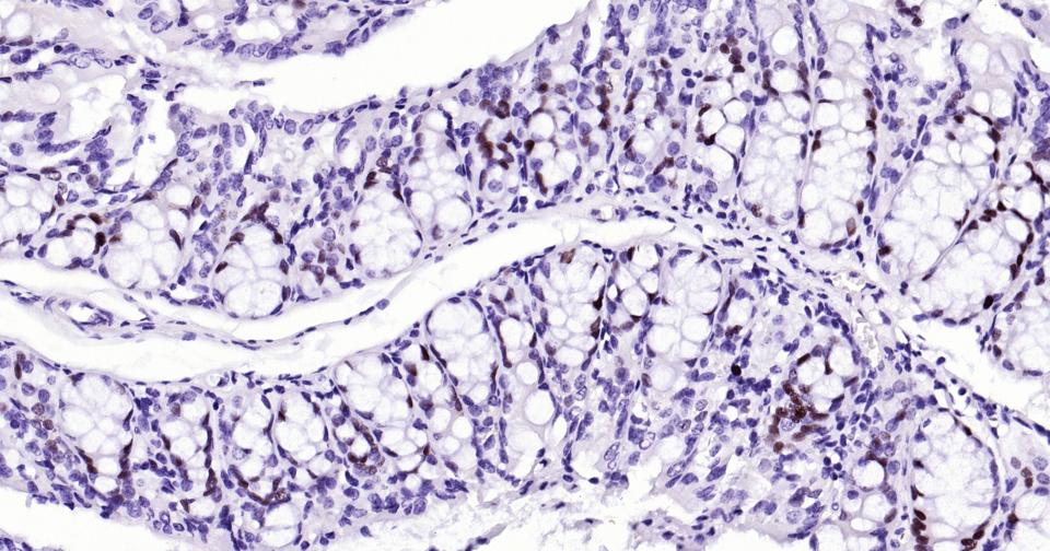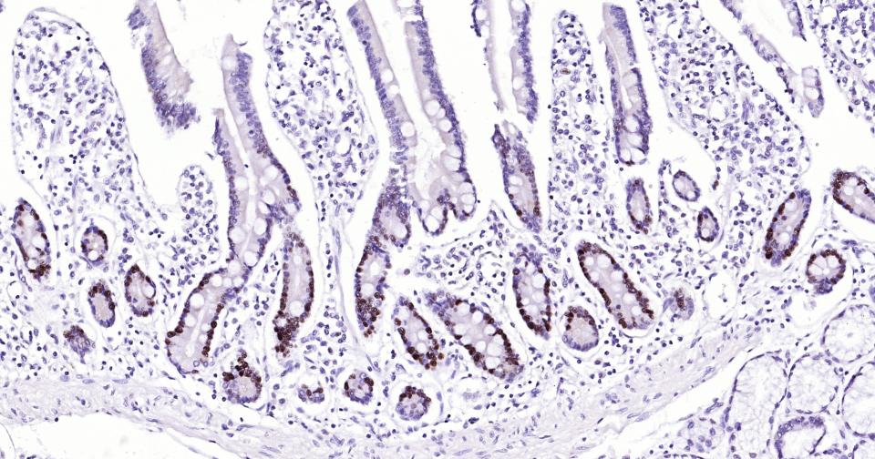 Paraformaldehyde-fixed, paraffin embedded Human Duodenum; Antigen retrieval by boiling in sodium citrate buffer (pH6.0) for 15 min; Antibody incubation with PCNA/HRP Monoclonal Antibody, Unconjugated(bsm-33035M-HRP) at 1:200 overnight at 4°C, followed by DAB (C-0010) staining.