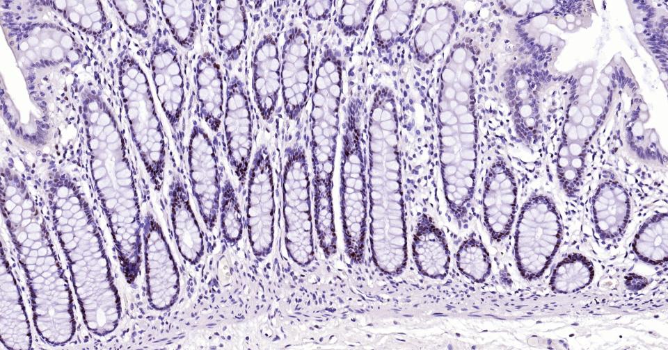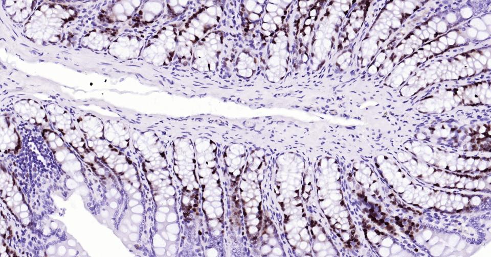Paraformaldehyde-fixed, paraffin embedded Mouse Colon; Antigen retrieval by boiling in sodium citrate buffer (pH6.0) for 15 min; Antibody incubation with PCNA/HRP Monoclonal Antibody, Unconjugated(bsm-33035M-HRP) at 1:200 overnight at 4°C, followed by DAB (C-0010) staining.