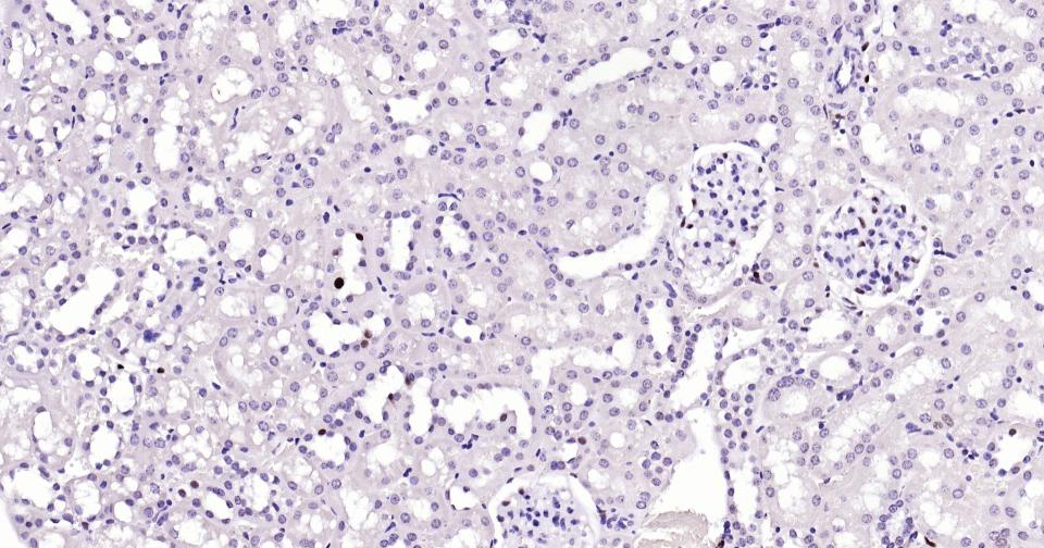 Paraformaldehyde-fixed, paraffin embedded Mouse Kidney; Antigen retrieval by boiling in sodium citrate buffer (pH6.0) for 15 min; Antibody incubation with PCNA/HRP Monoclonal Antibody, Unconjugated(bsm-33035M-HRP) at 1:200 overnight at 4°C, followed by DAB (C-0010) staining.
