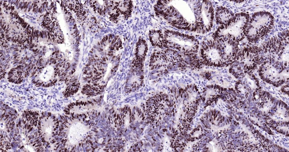 Paraformaldehyde-fixed, paraffin embedded Human Colon Cancer; Antigen retrieval by boiling in sodium citrate buffer (pH6.0) for 15 min; Antibody incubation with PCNA/HRP Monoclonal Antibody, Unconjugated(bsm-33035M-HRP) at 1:200 overnight at 4°C, followed by DAB (C-0010) staining.