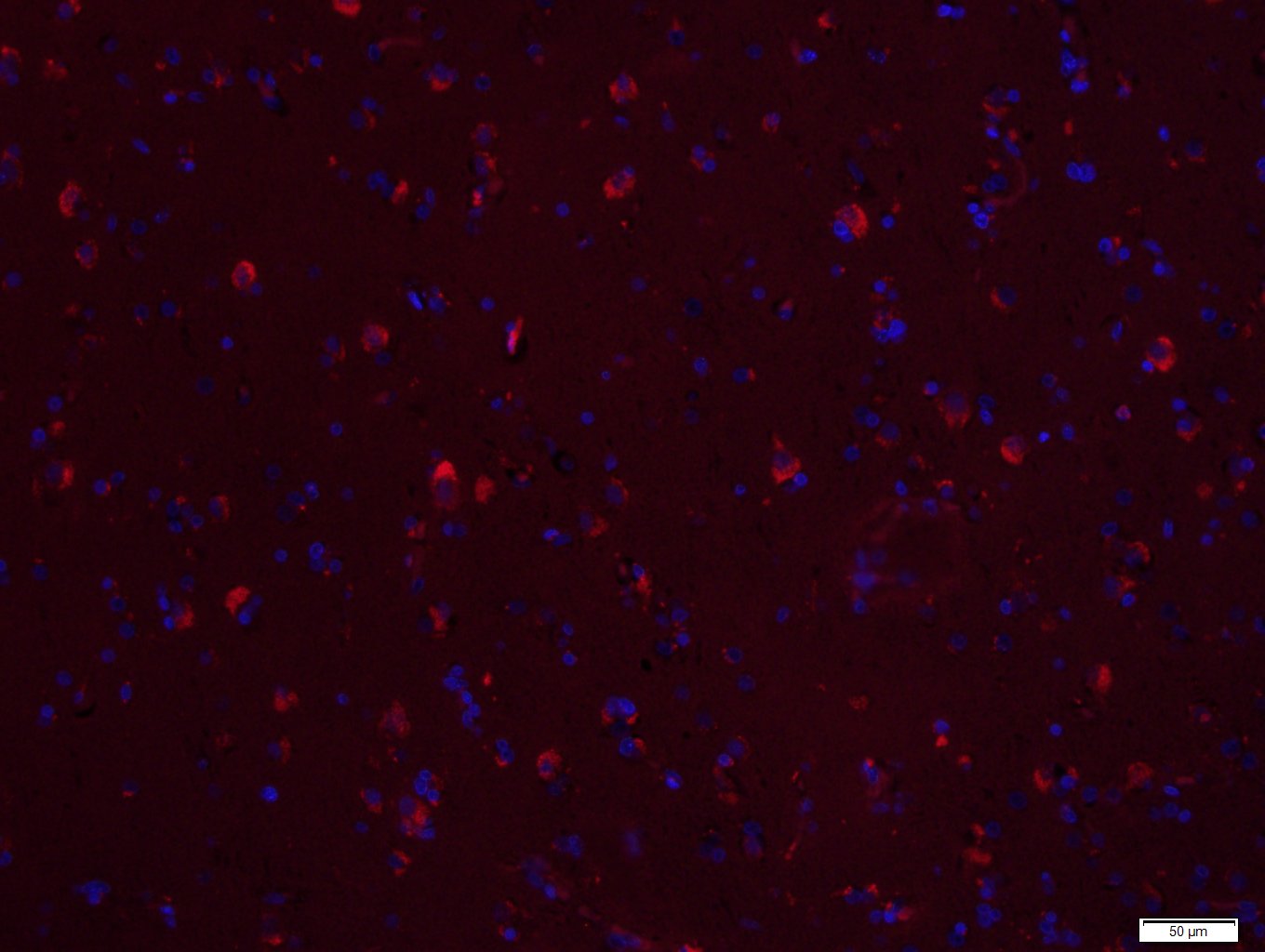 Paraformaldehyde-fixed, paraffin embedded (Human brain glioma); Antigen retrieval by boiling in sodium citrate buffer (pH6.0) for 15min; Block endogenous peroxidase by 3% hydrogen peroxide for 20 minutes; Blocking buffer (normal goat serum) at 37°C for 30min; Incubation: Anti-AD7c-NTP Antibody, conjugated (bsm-10818M-Cy3) 1:400, 1.5 hours at 37°C; DAPI (5ug/ml, blue, C-0033) was used to stain the cell nuclei.